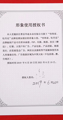 “牡丹花”“怡飾家”品牌是公司主營的注冊商標(biāo),并與明星句號(hào)達(dá)成合作。14年的板材專業(yè)精神和持續(xù)穩(wěn)健的行業(yè)資源優(yōu)化整合。